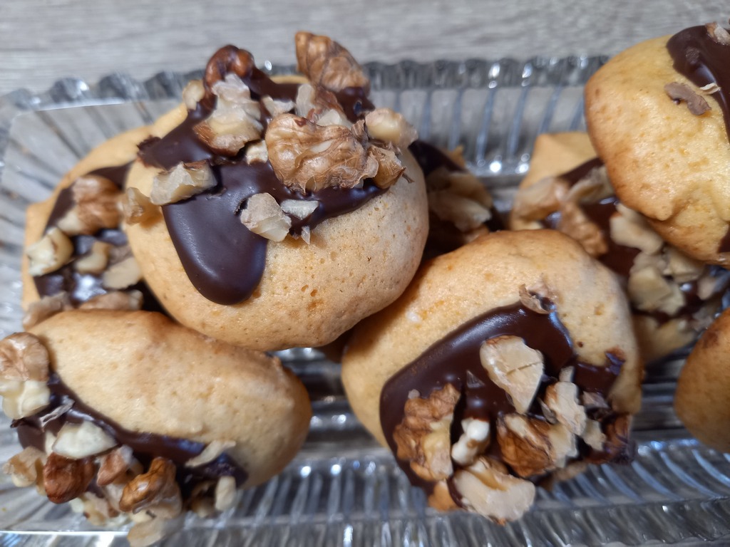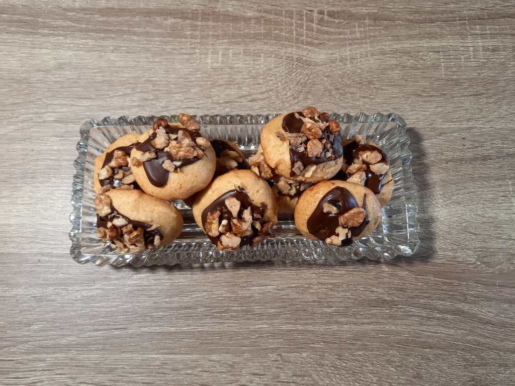 Чтобы сделать его поинтереснее, можно расплавить 30 гр. шоколада на пароводяной бане, добавить в растопленный шоколад столовую ложку растительного масла и полить этой глазурью печенье, присыпав сверху измельчёнными грецкими орехами.