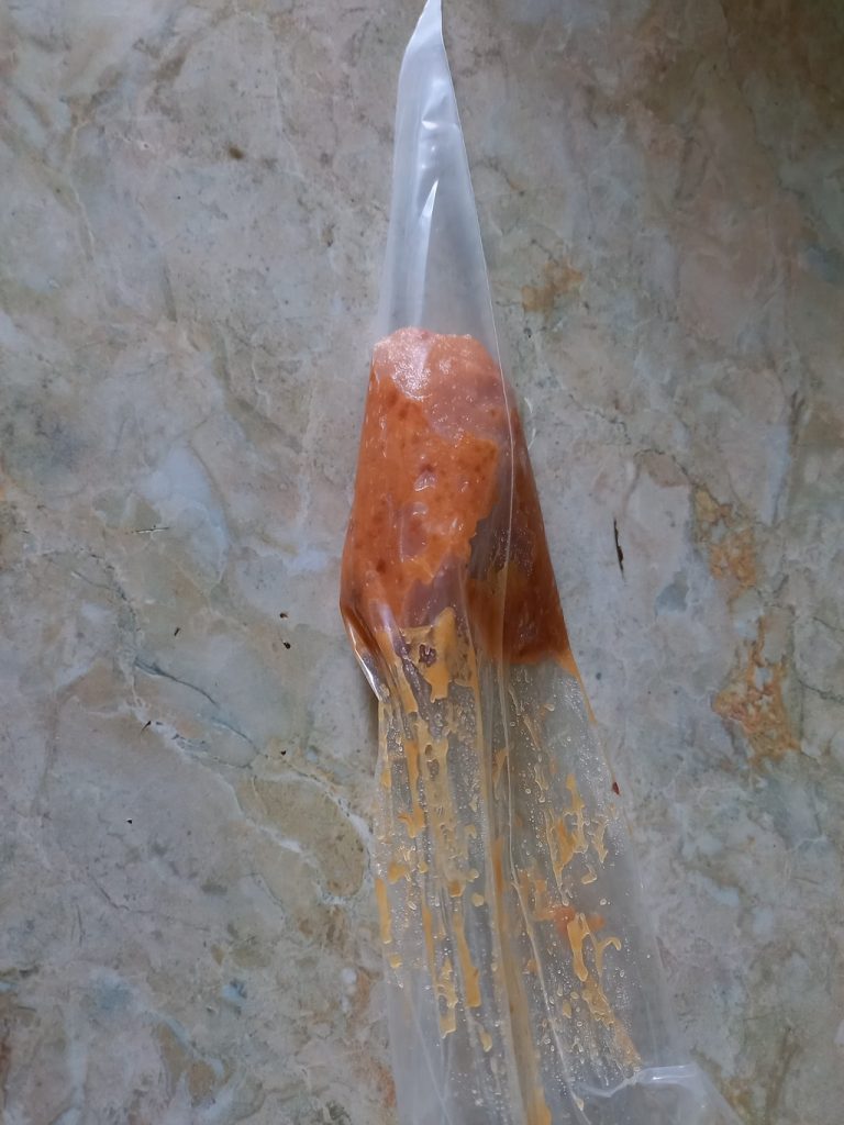 Для удобства я переложила начинку в одноразовый кондитерский мешок и аккуратно заполнила из него серединки печенья.