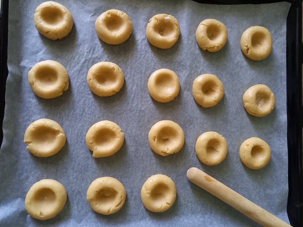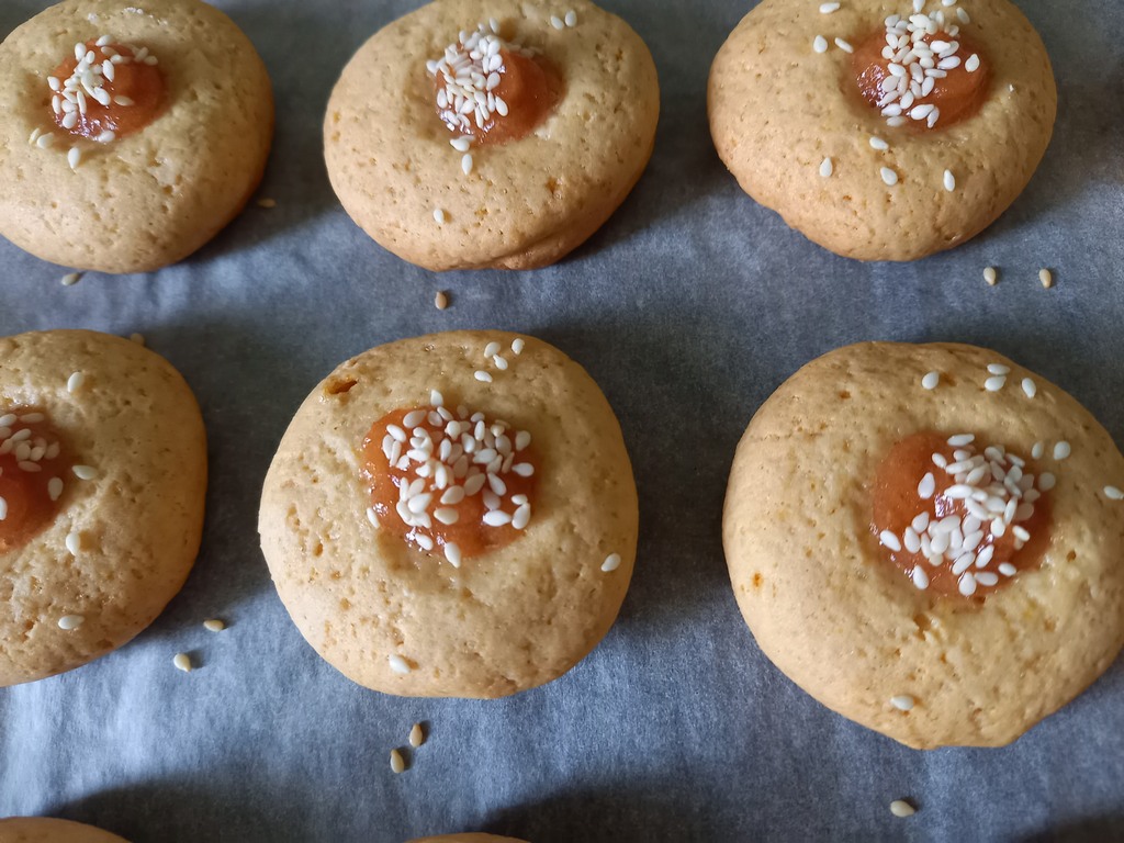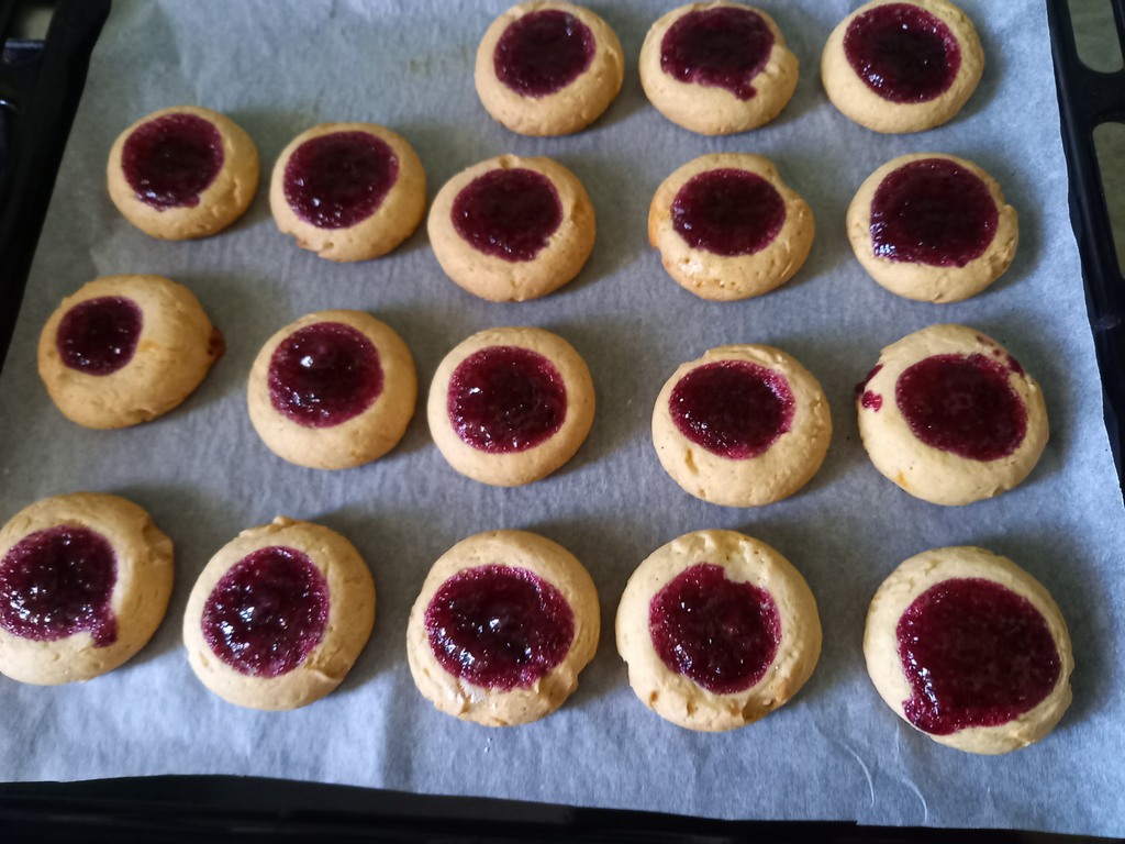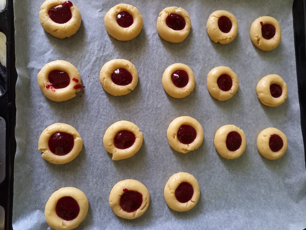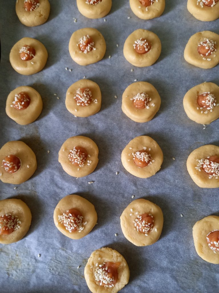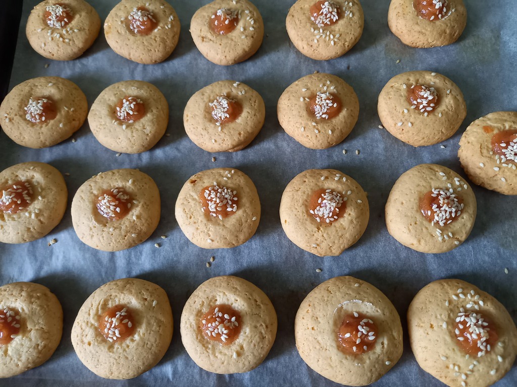 Хочу обратить внимание, что нужно смешивать варенье обязательно с кукурузным крахмалом. А дальше можно посыпать сверху кунжутом или орехами и наше печенье приобретёт новый вид.