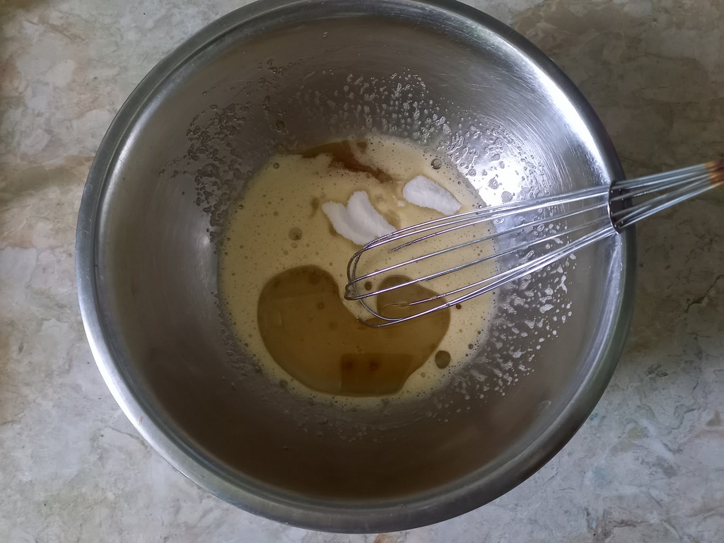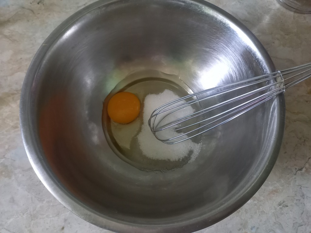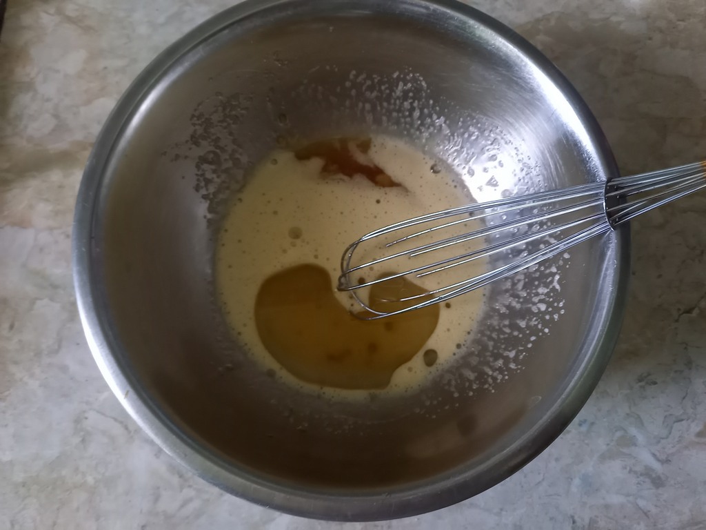 Венчиком хорошо взобьём яйцо до появления белой пены. Во взбитое с сахаром яйцо вливаем 3 столовые ложки растительного масла и 2 столовые ложки мёда. Объединим венчиком все продукты в пышную массу.