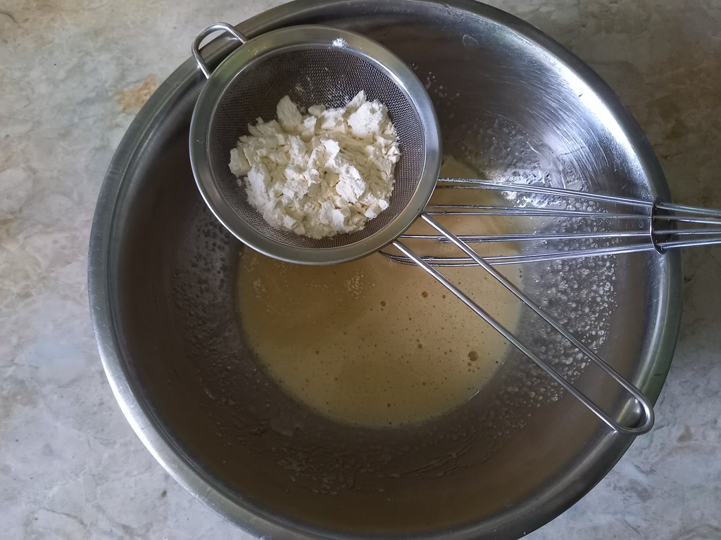 Во взбитую смесь просеим 6 полных столовых ложек муки и добавим чайную ложку без горки пищевой соды.
