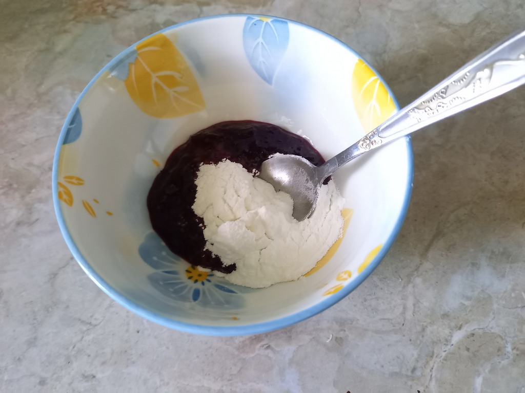 Берем для начинки столовую ложку смородинового варенья, добавляем чайную ложку кукурузного крахмала, перемешиваем и этой начинкой заполняем углубления в печеньях.