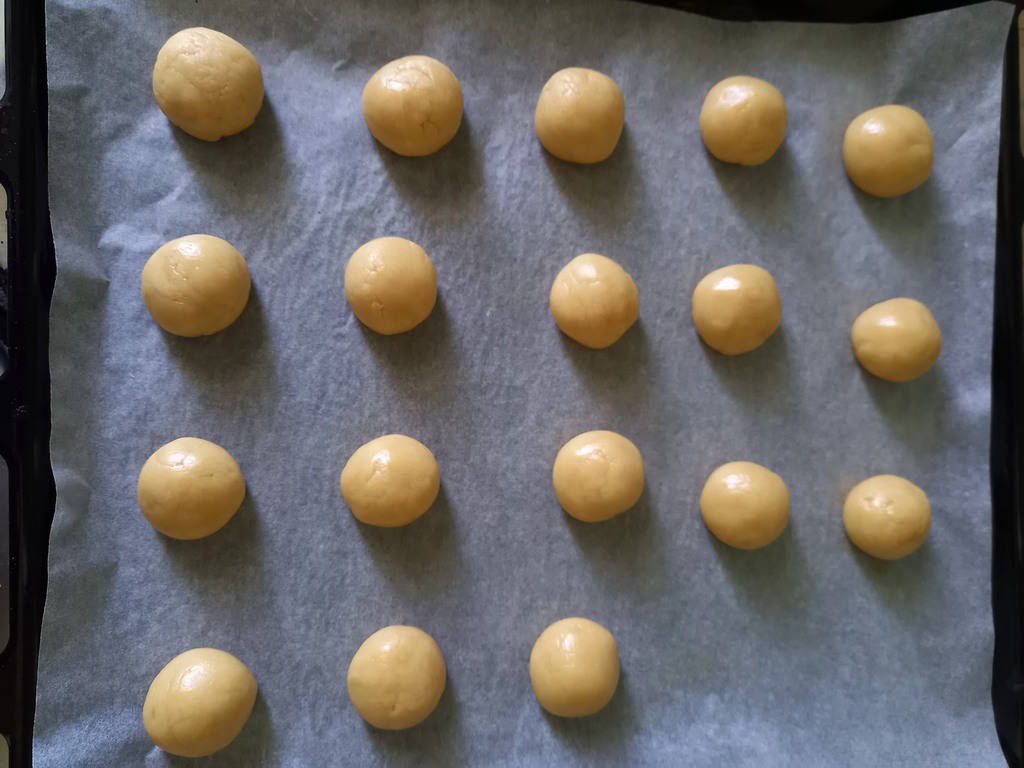 Включаем духовку, застилаем противень бумагой для выпечки и будем формировать печенье. Руки лучше смочить водой, и тогда тесто не будет липнуть к рукам.